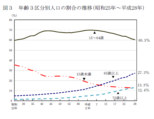 65歲以上的人口比重已經(jīng)上升至紀(jì)錄新高的27.3%,而15歲以下人口占比則跌至紀(jì)錄新低。15-64歲的勞動(dòng)力人口繼續(xù)下滑至60.3%,為1951年以來(lái)最低。