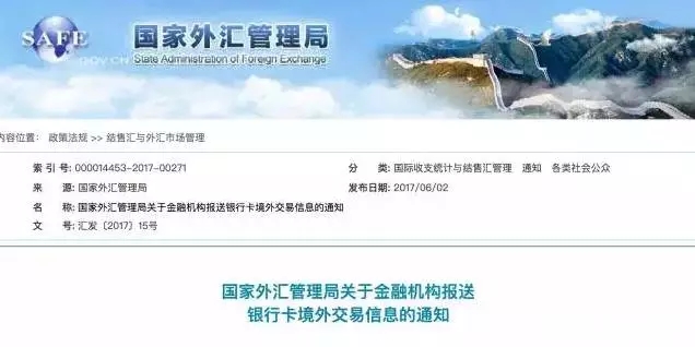 6月2日,外管局官方網(wǎng)站發(fā)布了《國家外匯管理局關(guān)于金融機(jī)構(gòu)報送銀行卡境外交易信息的通知》,通知寫道,為加強(qiáng)銀行卡境外交易監(jiān)測管理,維護(hù)銀行卡境外交易秩序,外管局決定開展銀行卡境外交易信息采集工作,自2017年9月1日起施行。