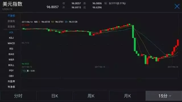 在市場表現(xiàn)方面(以下市場表現(xiàn)均截至北京時間3:30分),與今年3月加息時的走勢相似,美元指數(shù)再次出現(xiàn)大幅波動的情況。在美聯(lián)儲公布利率決議前半個小時左右,美元指數(shù)突然出現(xiàn)大幅跳水,一度從97.07點(diǎn)跌至96.32的低點(diǎn)。在耶倫新聞發(fā)布會開始后,美元指數(shù)快速反彈至96.81點(diǎn)附近。