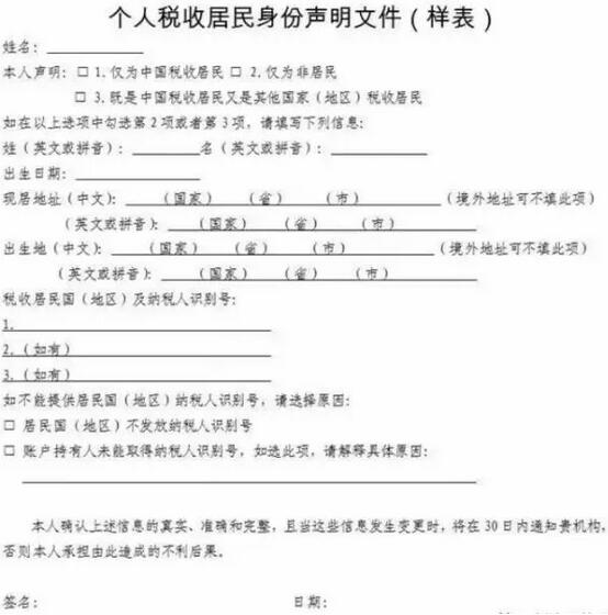 根據調查辦法的規(guī)定,從今年7月1日起,個人在金融機構開立新賬戶時,應提供稅收居民身份聲明文件。具體解釋就是用來作為識別賬戶持有人是否為非居民個人。